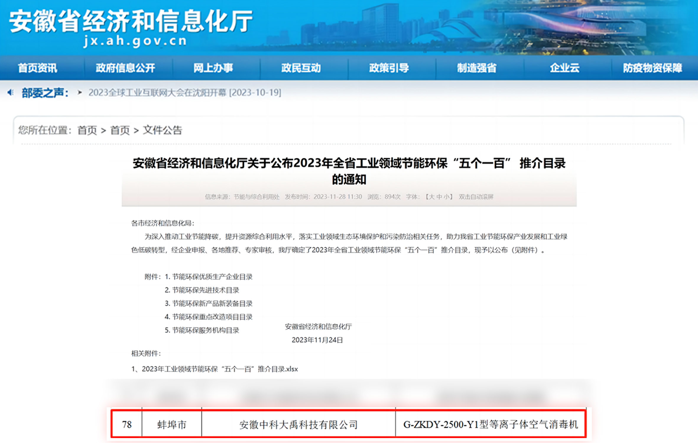 入選2023年全省工業(yè)領域節(jié)能環(huán)?!拔鍌€一百”推介目錄(節(jié)能環(huán)保新產(chǎn)品新裝備:G-ZKDY-2500-Y1型等離子體空氣消毒機)